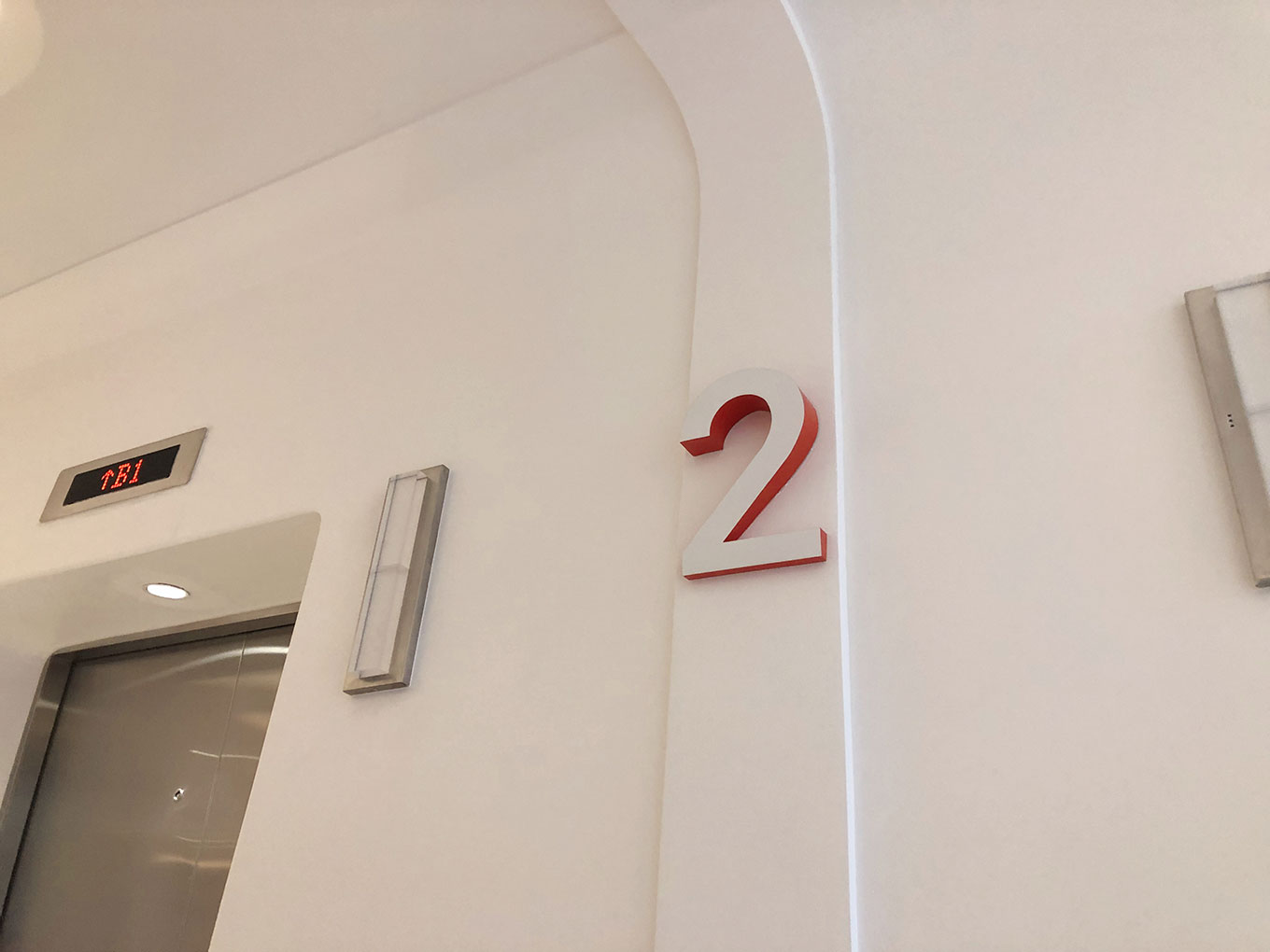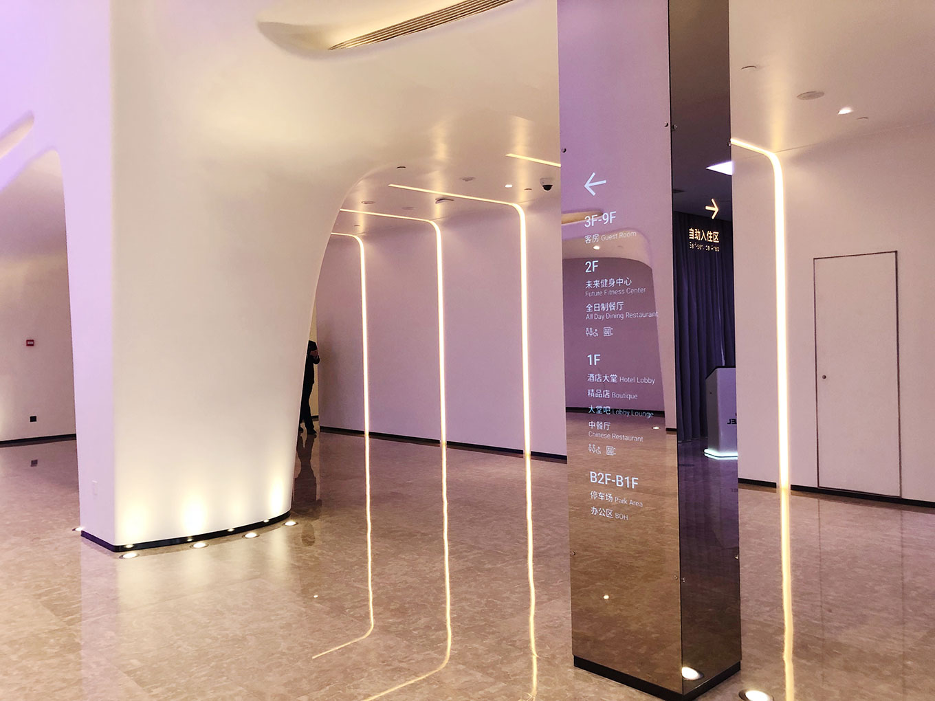 在这里能感觉到进入菲住布渴酒店大堂,设计未来感十足,进入大堂即有电子显示的标识,人和时代标识公司把阿里橙色在标识设计中的应用,简结的标识及立体字。并配有自助机就开始进行人脸识别。阿里方面就声称菲住布渴是全球第一家支持全场景刷脸的酒店。在整个入住体验中钛媒体也发现,包括电梯、房间、餐厅、健身房、酒吧等多个场景内都有人脸识别科技的应用。