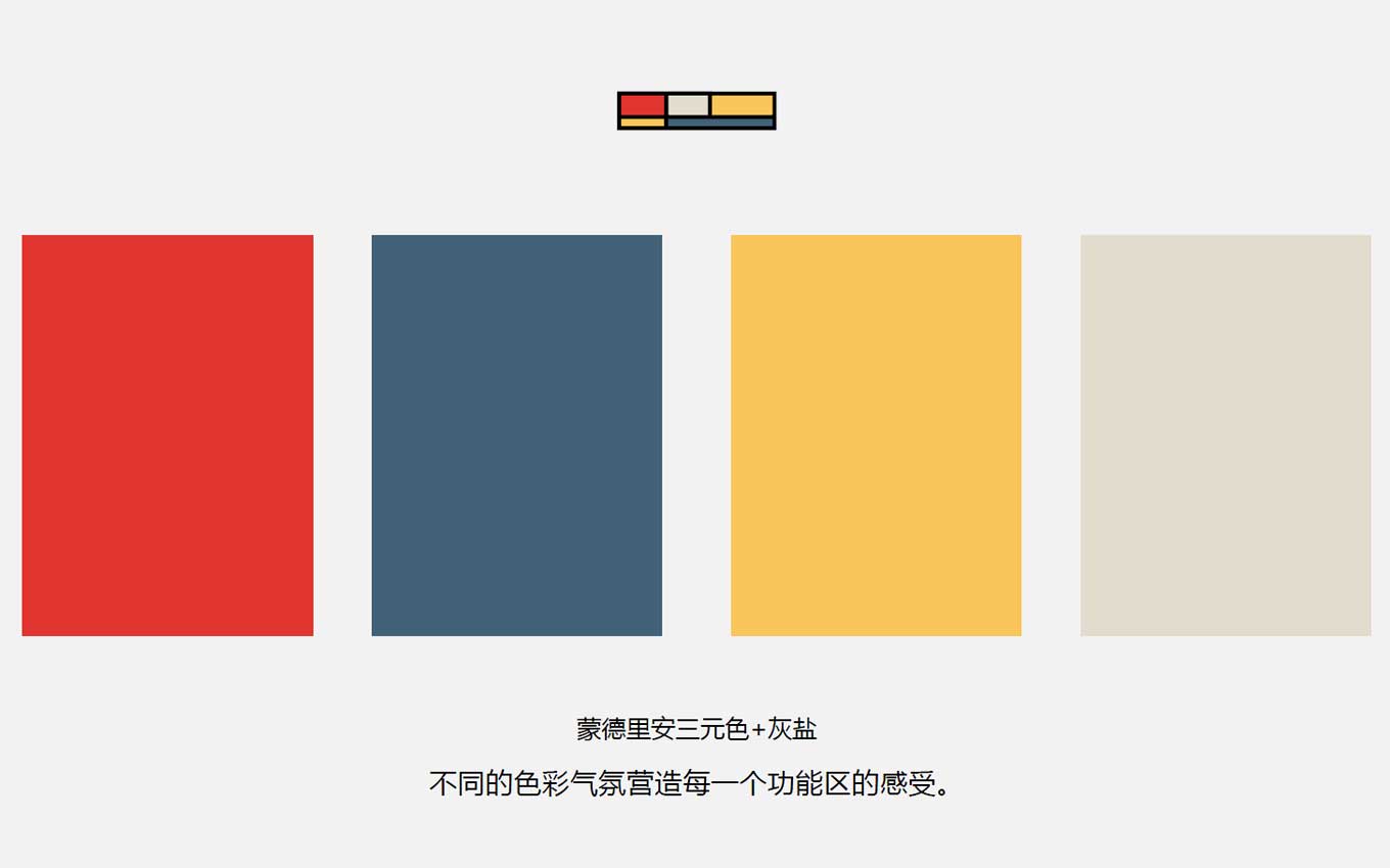 蒙德里安三元色+灰盐,不同的色彩气氛营造每一个功能区的感受,